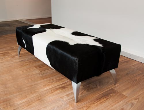 Black & white cowhide ottoman with curved metal legs 120cm x 50cm x 40cm tall.