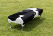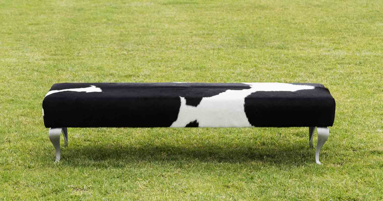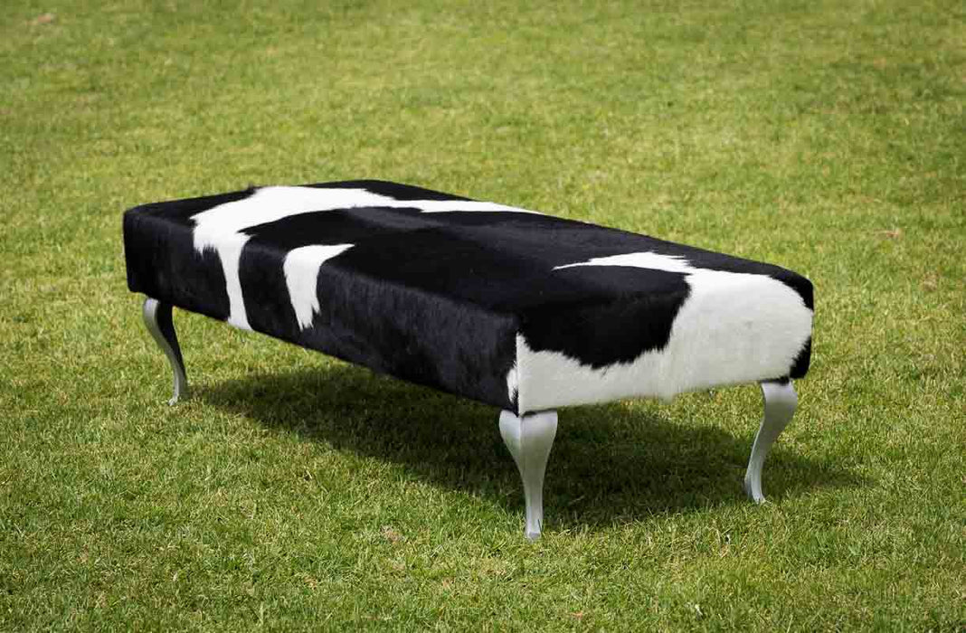 Black & white cowhide long bench ottoman with modern Queen Anne metal legs 160cm x 55cm x 40cm tall.
