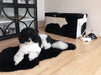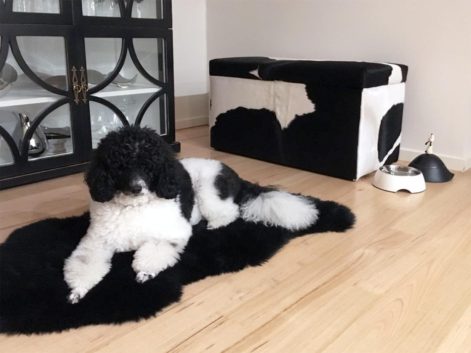 A large storage ottoman covered in a black & white cowhide 90cm x 50cm x 45cm tall.